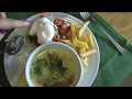 На обед и ужин подают блюда из различных видов мяса (баранины, говядины), присутствует в меню жареная курица, сыр, морепродукты, сосиски, салаты, овощная нарезка, картофель в различных видах (дольками, фри), супы, рис и рыбные блюда.