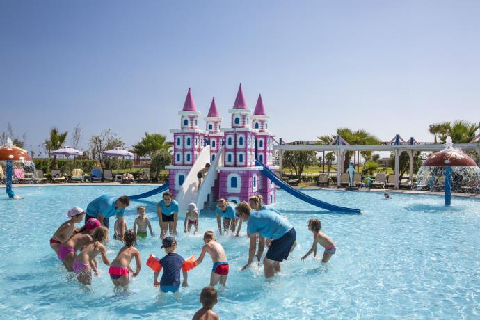 Детская аква-инфраструктура: В отдельном мелком бассейне установлен игровой «замок принцессы» с 4 горками. В отеле работает мини-клуб, есть прекрасный детский игровой городок (также в виде замка).